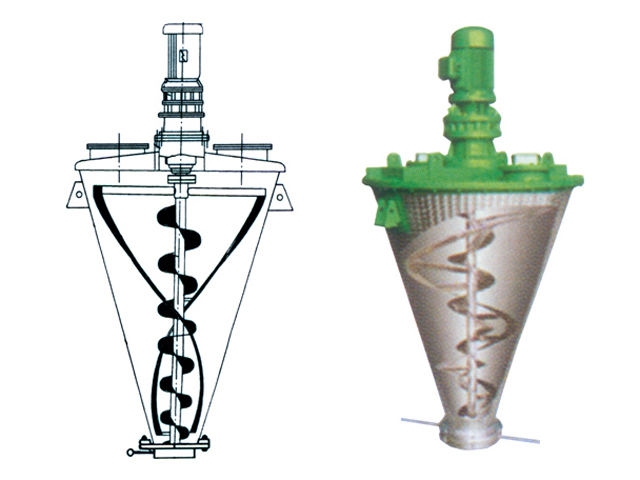 水平螺旋帶式攪拌機(jī)傳動(dòng)軸設(shè)有雙螺旋葉片,內(nèi)螺旋將物料輸送到外面,外螺旋將物料收集到內(nèi)部。