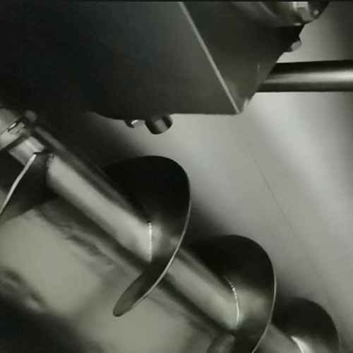 混合機二條非對稱長短螺旋的快速自轉(zhuǎn),將物料向上提升,形成二股沿筒壁自下向上的螺柱形物料流。